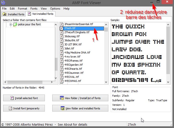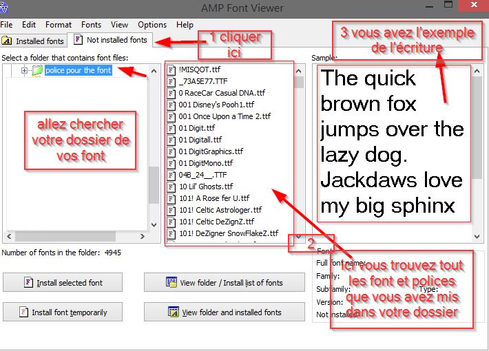 ***** Maintenant nous allons voir le fonctionnement de ce petit Logiciel ***** Double clic sur votre raccourci du bureau Comme vous pouvez voir sur la capture cliquer sur not installed fonts Dans le volet de gauche aller chercher votre dossier que vous avez crée pour y placer toutes vos polices et fonts Au milieu vous voyez toutes les polices que vous avez dans ce dossier Et enfin le cadre de droite vous montre l’exemple de l’écriture