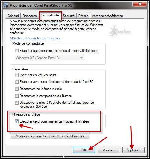 Cliquer sur propriété/ Compatibilité ******* 1. Mode compatibilité Puis 2. Coché exécuter ce programme en tant administrateur
