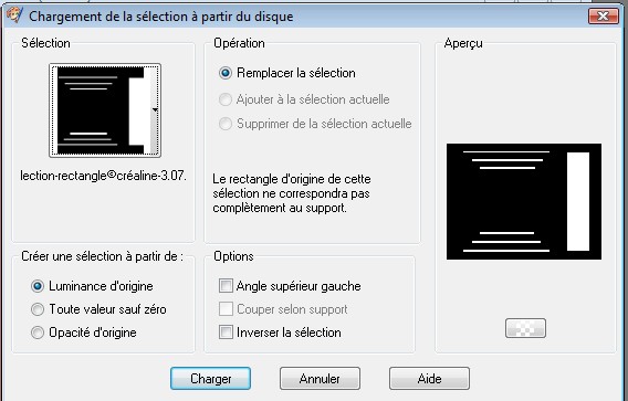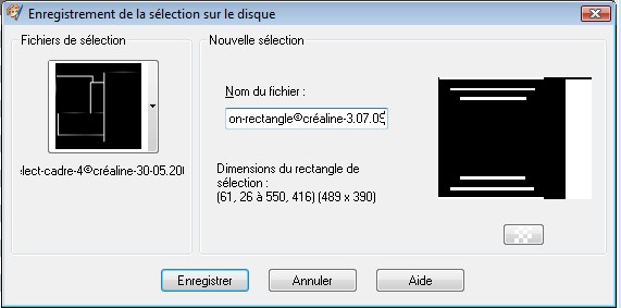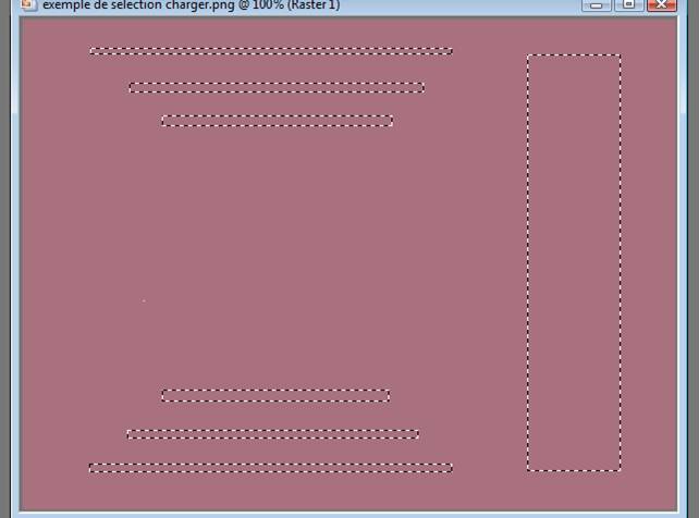 Maintenant vous allez crée une sélection avec votre outil de sélection /rectangle Vous n’êtes pas obligé de faire la même sélection que moi Vous allez créer votre sélection Tracer des rectangles, dans votre calque transparent En vous guidant de la règle qui c'est mise Je vous mets ici mon modèle de sélections Voila ce que ca doit donner Quant vous avez fini de créer votre sélection Maintenant il faut l'enregistrer dans votre dossier /sélection de Psp Sélection/charger et enregistrer une sélection/enregistrer sur le disque Voir capture ci dessous N'oubliez pas de la nommer, pour la retrouver dans votre dossier Et faites enregistrer Voila votre sélection est dans votre dossier Quant vous ferrez une création et que vous voulez utiliser votre sélection il suffira D’aller la chercher votre sélection Vous faite le même chemin que pour l'enregistrer, sauf Que vous faites charger à partir du disque Vous aurez ce résultat Remettez un nouveau calque raster su votre arrière plan avant de charger votre Sélection