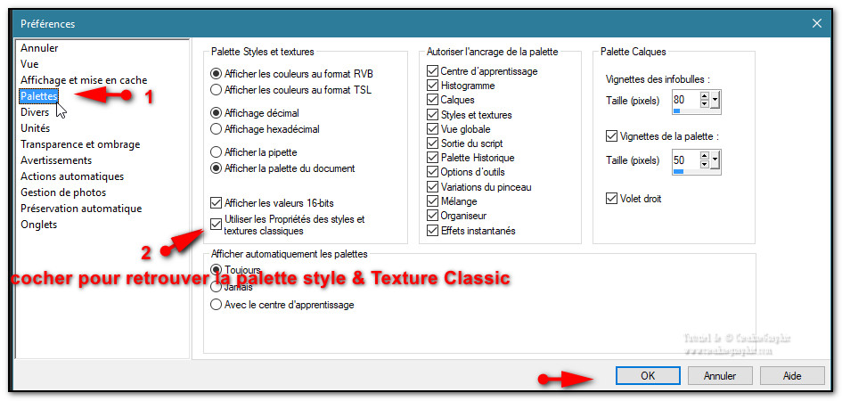 La fenêtre suivante s'ouvre Cliquer sur Palettes à gauche dans la fenêtre qui s'ouvre Cocher Utiliser les Propriétés des Styles et Textures Classiques et faites Ok