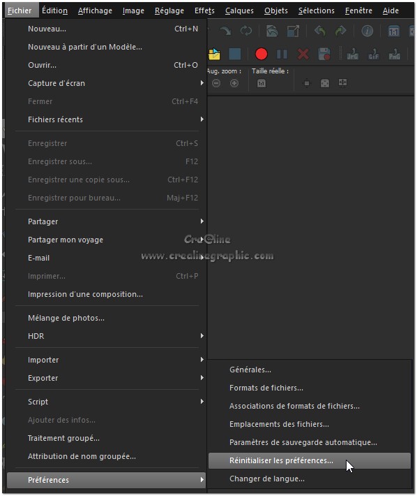 Si votre Psp ne fonctionne plus correctement Vous pouvez Réinitialiser votre logiciel ,cela corrige pas mal de problèmes Outil texte ne fonctionne plus correctement ,les outils disparues ect ..... ********** Suivez les explications des captures ci-dessous Fichier /préférences /Réinitialiser les préférences