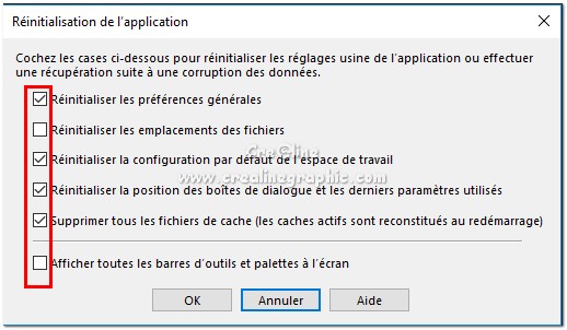 Cocher tout comme ci dessous Ne cochez pas Réinitialiser les emplacements des fichiers Sinon vous devrez remettre tout vos paramètres par défaut que vous avez ajouté ainsi que vos filtres , pinceaux ,dégradés ect ....