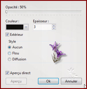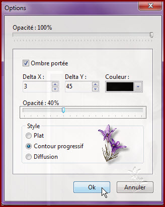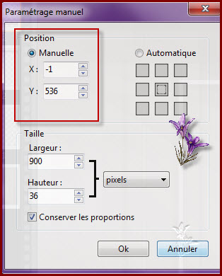 Filtre/netteté/contour net 6. Calque/nouveau vierge/largeur 500 Appliquer les options du calque coché Conservé les proportions coché/couleur arrière plan Opacité du calque à 70 Calque/centrer le calque /dans l’image Sélectionner le calque avec votre baguette magique Sélection /contracter de 5 Édition/ couper 7. Calque/nouveau vierge Manuel coché /X 0 / Y 23 Taille 900/36 Conserver les proportions cochées Appliquer les options de calque coché Couleur avant plan Mode du calque sur Incrustation Calque /dupliquer Paramétrage manuel