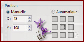 Calque /effet bord /lisser /refaire une fois Transformation manuel /échelle à 50 Paramètrage manuel X 398 / Y 49 Calque/dupliquer Paramètre manuel X 345 /Y 221 Fusionner avec le calque inférieur Ombre portée