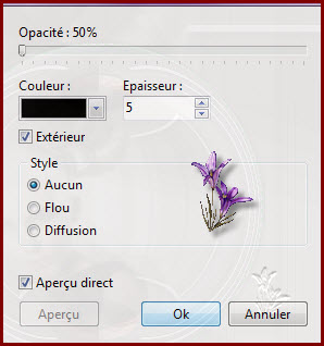 Calque/effet bord /contour progressif/rayon 4 Fusionner avec le calque inférieur 14. Image/encadrement extérieur larg.2 /couleur arrière plan Image/encadrement extérieur/larg. 45 /couleur avant plan Sélectionner l’encadrement Sélection /inverser Filtre/esthétique/contour progressif