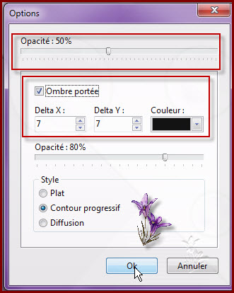 Edition/copier et coller Mettre le calque en mode Produit 7. Calque/nouveau vierge Sélection/charger une forme/charger la sélection02_marly Clic droit/Paramètrage manuel/manuel coché X 75 et Y 0 Remplir de la couleur arrière plan Clic droit ombre portée