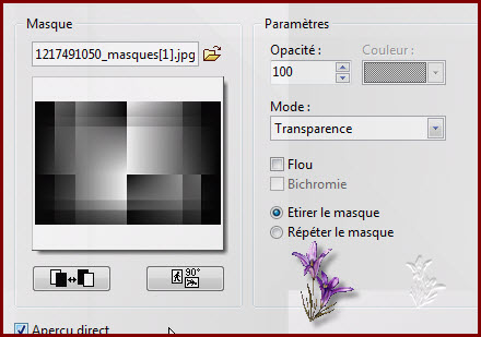 Fusionner les calques 3/2 et fond 10. Rendez le calque 1 invisible Placer sur votre fond Calque/nouveau /vierge Remplir de la couleur noir Photomasque Aller chercher votre masque