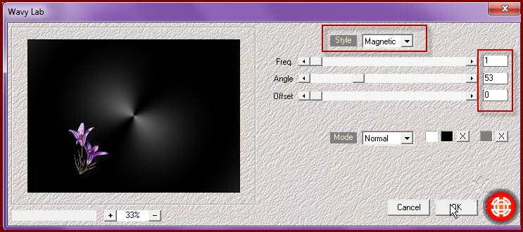 1. Fichier /nouveau /calque de 900 /600 blanc Filtre/filters 8 bf/Medhy /Wavy Lab Attention si vous utilisez le Medhy/Wavy Lab 1.1 /il faut inverser vos couleurs de votre palette de couleurs noir en arrière plan pour avoir le même résultat