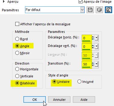 Effet /effet bord /accentuer Fusionner le groupe 33. Passez ce calque en mode de mélange Luminance Héritée Baisser l’opacité du calque à 55 34. Appliquer une ombre portée de 10/10/50/5 noir 35. Placez-vous sur votre fond (Raster 1) 36. Calque /dupliquer 37. Passez ce calque en mode mélange Lumière Douce 38. Replacez vous sur votre fond le calque de bas de pile (Raster 1) 39. effet /effet image/mosaïque sans jointures