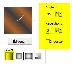 19. Appliquer une ombre portée de 0/0/30/20 noir 20. Positionnez vous sur votre fond 21. Sélection/charger à partir du canal alpha la sélection 3 22. Calque /nouveau calque 23. Remplir avec votre couleur ar plan /opacité du pot de peinture 24. Désélectionner tout 25. Effet/modules externes/Umilited/&<Background Designers IV/sf 10 Slice N Dice 26. Passez ce calque en mode Recouvrement 27. effet/modules externes/Toadies/Weaver… 28. Réglage/netteté /davantage de netteté 29. Calque /dupliquer Passez en mode Ecran ou autre selon vos couleurs 30. Effet/modules externes /Ap Innovation /Lines- Silverlining 31. Fusionner avec le calque du dessous 32. Placez-vous en haut de pile 33. Sélection/charger à partir du canal alpha la sélection 4 Transformer la sélection en calque Désélectionner tout /appliquer une ombre portée comme précédent /toujours en mémoire 34. Placez la couleur #b16526 Dans la palette style et texture en av plan Préparé un dégradé Halo comme précédent toujours en mémoire