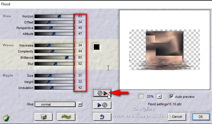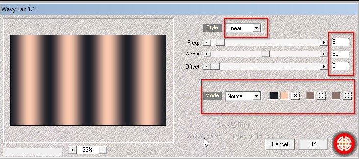 Couleur avant plan : #fbc9ae Couleur arrière plan : #1b1e25 1. Ouvrir votre calque Alpha sélection dans votre psp /Maj D pour le dupliquer Ou Fenêtre /dupliquer Nous travaillons sur la copie Effet /modules externes /Medhy /Wavy Lab 1.1