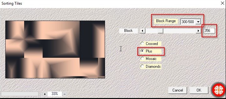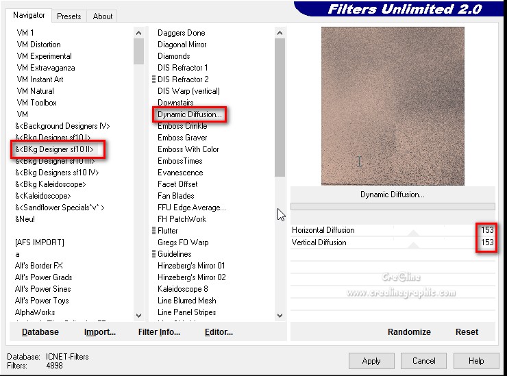 Calque /nouveau calque Versez la couleur arrière plan dans votre sélection Garder la sélection active Calque /fusionner avec le calque du dessous ( 2 fois ) Effet /modules externes /Unlimited /&<BKg Designer sf10 II>/Dynamic Diffusion...