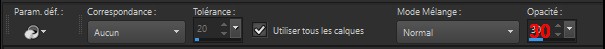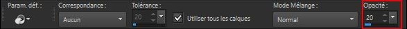 Sélection/transformer la sélection en calque Garder la sélection active Sélection/modifier /contracter de 30 pixels Calque /réorganiser /déplacer vers le haut 4 Toujours la sélection active Calque /nouveau calque Remplir de la couleur arrière plan Sélection/modifier /contracter de 2 pixels Édition/effacer ou supprimer au clavier Placer la couleur #ffffff blanc en arrière plan Outil pot de peinture configurer comme ci-dessous Opacité sur 20