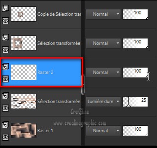 Passer ce calque en mode mélange /Lumière Dure Baisser l’opacité à 25 3 Positionnez vous sur votre fond (Raster 1) Sélection/charger à partir du canal alpha la sélection #2