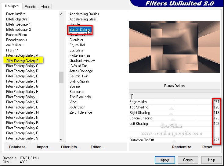 6 Positionnez vous sur votre fond (Raster 1) Effet /modules externes /Unlimited/Filter Factory Gallery B/Button de Luxe