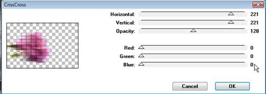 Activer le tube de la rose /Edition copier/édition Coller Calque/agencer/ déplacer vers la bas/la faire glisser sur la gauche /mettre le tube sur mode/luminance Héritée Effet/distorsion/Vent /100 a gauche /répéter 100 a droite Voir capture d’ecru