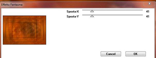 Calques/fusionner/tout aplatir Image /ajouter bordure de 2 coul. Foncé Image ajouter une bordure de 50 coul.claire Sélectionner avec la baguette magique/tolérance 0 Remplir du dégradé Halo angle0/répétition 5 Effet /modules externes/Italian editors effect/effetto-Fantasma