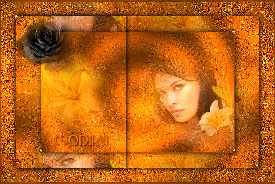 Placer la déco coin Effet/modules externes/simple/top left mirror Effet/effet 3 D ombre portée 3/3/50/5 noir Placer votre texte Monika avec la police de votre choix Et appliquer une ombre portée Calque /fusionner/fusionner tout aplatir
