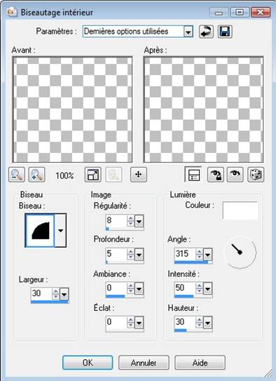 Effet/effet bord/accentuer Rester selectionner appliquer le filtre pool shadow même configuration que ci-dessus Selection/inverser, appliquer une ombre portée,6/6/60/5/noir, refaire avec -6/-6/60/5,déselectionner Ajouter bordure de 5 pixels couleur arrière plan, selectionner la bordure appliquer ,pool shadow , même configuration 50/50/50/50/50/50/128/128, Rester selectionner mettre un biseau intérieure avec les Paramètres comme capture d’écran