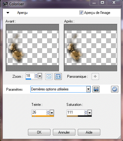 Sélection/inverser Effet/modules externes /eyes candy impact/perspective shadow comme plus haut Sélection /déselectionner tout Image/ajouter une bordure/de 2 couleurs foncé ** Copier /coller comme nouveau calque le tube fleur Placer a droite voir modèle Réglage/teint et saturation/coloriser/teinte 26/saturation 111