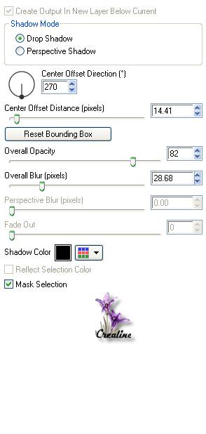 Sélection /transformer la sélection en calque Mettre le calque en mode recouvrement Sélection /inverser/effet /modules externes/eyes candy impact/perspective shadow/se mettre sur basic mettre les paramètres comme ci dessous