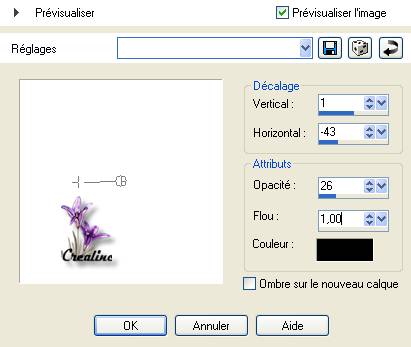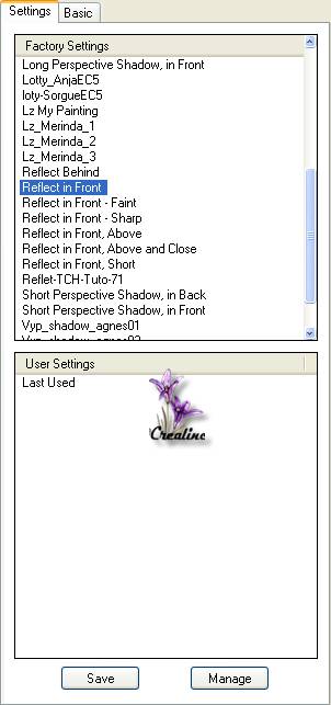 Mettre le calque en mode recouvrement Effet /modules externe/eyes candy 5impact/perspective shadow Cliquez sur basic et configurer comme ci dessous