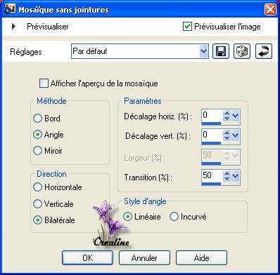 Fusionné les calques visibles Calque /dupliquer/image redimensionné à 70% Tous les calques décochés Effet/image /mosaïque sans jointures