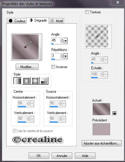 Couleurs avant plan : #b4a5aa (claire) Couleur arrière plan : #6a5b5e (foncé) ******************* ******************* Préparée un dégradé Linéaire /Angle 45 /Répétition 3 Inverser non coché