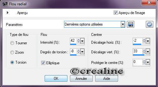 Calque dupliquer/image /miroir/fusionner /calque du dessous Effet /effet 3D /Ombre portée /-10/ -10/ 30/ 2 noir Calque dupliquer/effet /effet distorsion/vent/direction gauche/intensité 60 Effet /effet bord/accentué Agencer /déplacer vers le bas Calque/fusionner les calques visibles ******************** Activer votre tube calguismistedlarme9610/édition copier /édition coller Comme nouveau calque sur votre tag/ne pas déplacer il est Au bon endroit/fusionner les calques visibles/ édition /copier ***************** Image /redimensionner a 90 % tous les calques décochés Édition collé comme nouveau calque Réglage /flou /flou radial