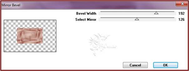 17. Fusionner /calque du dessous /répéter une fois 18. Image /redimensionner à 60% /tous les calques décochés Placer en bas à droite (voir modèle) 19. Fermer l’œil de ce calque /vous positionnez sur le fond (raster1) 20. Calque /dupliquer/image/redimensionné à 50%/tous les Calques décochés 21. Effet/modules externes/Alf’S Border FX/Mirror Bevel