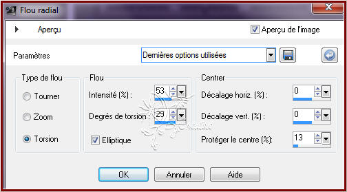 32. Refaire l’effet mosaïque sans jointure comme au point 22 33. Mettre le calque sur mode multiplier 34. Vous remettre sur le calque du haut et décoché l’œil 35. Mettre ce calque en mode Lumière dure 36. Fusionner les calques visibles 37. Edition/ copier/image /redimensionné à 90% 38. Coller comme nouveau calque 39. Réglage/flou /flou radial