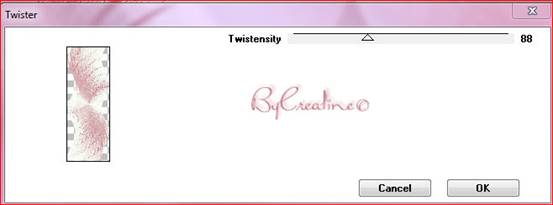 Mettre le calque sur mode recouvrement Effet/effet 3D ombre porté comme ci-dessus et refaire en négatif ********** Calque/nouveau calque/sélection/charger une sélection à partir du disque/la sélection crealine©27.03.2011-1 Remplir avec votre dégradé comme précédent Modules externes/filtre Funhouse /Twister a 80