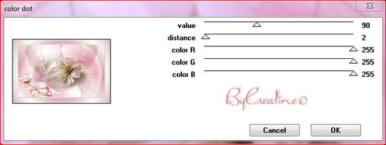 Calque dupliquer/ Image/rotation libre/ 90 droite et libre coché Les deux cases du bas décoché ********* Effet/modules externes /Pentacom/Dot and Cross