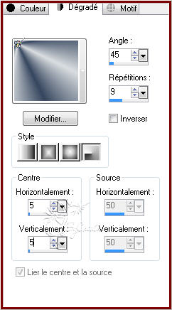 1. Ouvrir un nouveau calque de 900/550 2. Remplir votre calque de votre dégradé 3. Réglage/flou/flou gaussien sur 25 4. Effet/modules externes/Medhy/weaver