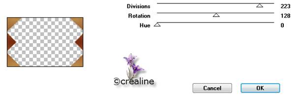 31. Fusionner tout aplatir 32. Image /ajouter une bordure de 2 pixels Couleur avant plan (foncé) 33. Image /ajouter une bordure de 45 pixels couleur arrière plan (claire) 34. sélectionner la bordure avec la baguette magique Tolérance et progressivité a 0 35. remplir de votre dégradé du départ/sélection/transformer la sélection en calque 36. Effet /modules externes /VM Distortion/kaléidoscope