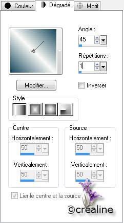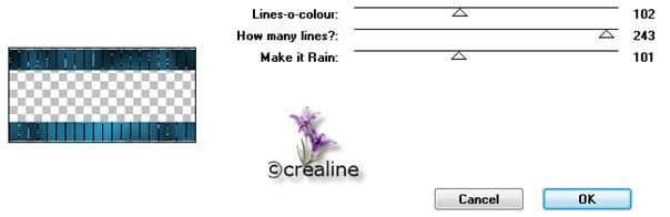 6. Image /redimensionné a 80% tous les calques décochés 7. Effet/effet de géométrique/Inclinaison Direction de l’inclinaison /horizontale cochée Angle d’inclinaison sur 25 Transparent coché 8. Baisser l’opacité de ce calque à 55 9. Calque/nouveau calque raster/ 10. Charger une sélection à partir du disque/aller cherché La sélection crealine_lou_1 11. Remplir la sélection de votre couleur avant plan 12. Effet /modules externes/Graphic Plus/cross Shadow Par défaut/50/50/50/50/50/50/128/128 13. Effet /modules externes/Two Moon/Wist it Would Rain