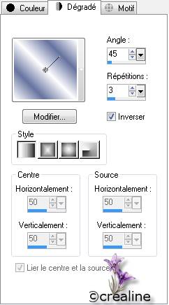 plan : #fefefe Ouvrir un nouveau calque de 900/550 Préparée un dégradé linéaire /angle 45 /répétition 3 Inverser coché