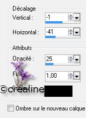 Effet 3 D /ombre portée par défaut 10/10/50/5 noir & refaire -10/-10/50/5 noir Mettre le calque en mode lumière douce 5. Calque /nouveau calque raster/sélection/charger à partir du disque La sélection crealine_arums_1 Remplir de la couleur avant plan (foncé)