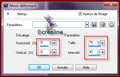 Désélectionner tout 21. /Calque /dupliquer/image/renverser 22. Fusionner avec le calque du dessous 23. Effet/effet distorsion/miroir déformant