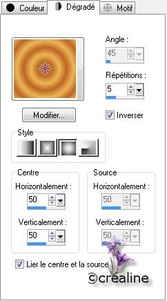 #eab653 Préparé un dégradé halo /angle 45/répétition 5 Inverser coché