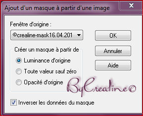 Calque /nouveau calque raster/remplir de la couleur arrière plan Calque /nouveau masque/à partir d’une image/aller chercher le masque crealinemask16.04.2011 luminance d’origine coché /inverser les données coché