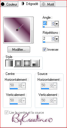 Couleurs avant plan :#fdd5e6 Couleurs arrière plan :#61284d Préparé un dégradé Halo :angle -45 /répétition 3 Inverser non cocher
