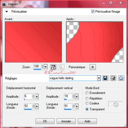 Glisser votre calque dans le coin supérieure Droite(voir modèle) Baisser l’opacité de ce calque a 60 d’opacité Réglage/netteté/netteté Dupliquer ce calque /image /renverser Calque/Fusionner/ Fusionner avec le calque du dessous 4. Vous remettre sur le calque raster 1/ Sélection/charger une sélection a partir du disque/select hello 3 Sélection /transformer la sélection en calque Effet /effet 3D /ombre portée 2/2/40/3 noir Refaire -2/-2/40/3 noir Sélection/désélectionner tout Effet/distorsion/Vague –voir capture pour les paramètres