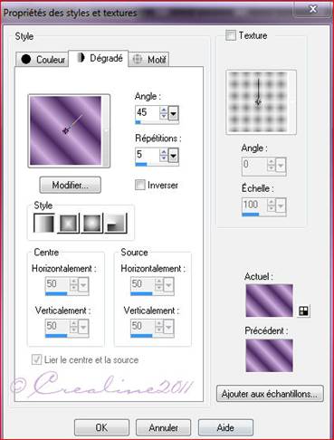 Préparé un Dégradé linéaire/angle 45/répétition 5/inverser non cocher