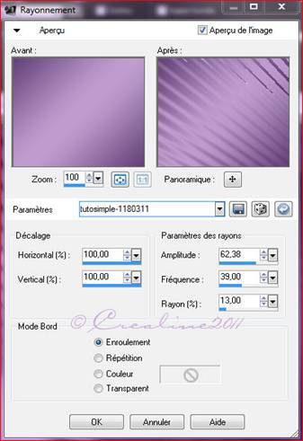 Effet /effet 3D 3/3/50/5 Calque/fusionner /fusionner avec le calque du dessous Calque/nouveau calque vierge Remplir du même dégradé Réglage/flou gaussien 32 Image/Redimensionner a 80% tous les calques décocher Effet modules externes/simple /half warp Effet/effet 3D/ombre portée 3/3/40/4 noir Refaire -3/-3/40/4 noir Effet /modules externes/simple/quik tile (ne tenez pas compte des couleurs de la capture d’écran)