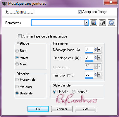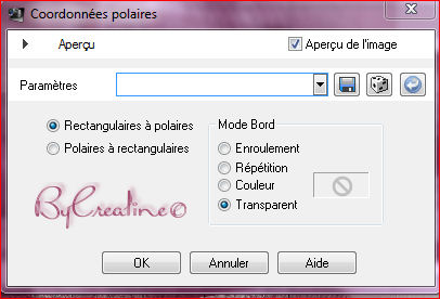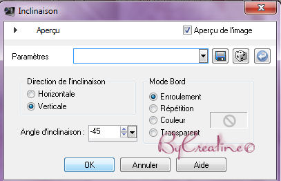 Fusionner avec le calque du dessous/calque/dupliquer Image /redimensionner a 80% tous les calques décochés Effet /effet géométriques/perspective horizontal Distorsion sur 60/ mode bord enroulement coché Déplacer ce calque vers la droite contre le bord Mettre ce calque sur mode /multiplier Fusionner tout les calques *********************** Sélection/charger a partir du disque la sélection crealineselect- michaella-1/sélection/transformer la sélection en calque Effet /effet 3D/4/4/30/1/noir dé sectionner tout Calque dupliquer/effet/distorsion/coordonnée polaire