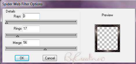 Nouveau calque raster/Remplir la sélection de la couleur arrière plan Sélection/modifier/contracter de 20 /touche supprime de votre clavier Désélectionner tout/sélectionner la bordure avec votre baguette magique Effet /modules externes /dsb flux/spider web