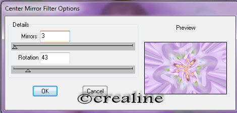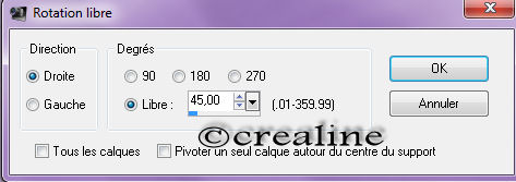 Calque/nouveau calque/remplir de la couleur arrière plan Calque/nouveau calque de masque/a partir d’une image Aller chercher votre masque crealinemask 2.05.2011/lumière d’origine coché/fusionner le groupe/réglage/netteté/netteté d’avantage ******************** Calque/dupliquer /image rotation libre/