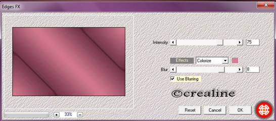 Couleurs avant plan : #da7e94 Couleurs arrière plan : #491b26 Préparée un dégradé linéaire avant plan/arrière plan Angle/45/répétition 3 inverser non cocher Ouvrir un nouveau calque de 900/550 Remplir de votre dégradé/réglage/flou /flou gaussien sur 25 Effet /modules externes/medhy/Edges FX