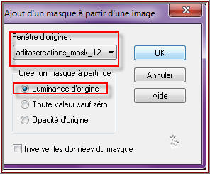 1. Ouvrir un nouveau calque de 900/600 2. Remplir de la couleur avant plan blanc ( claire) 3. Calque/nouveau calque raster/remplir de la couleur arrière plan (foncé) 4. Calque/nouveau calque de masque/à partir d’une image 5. Activer le masque Aditascréations_mask_12